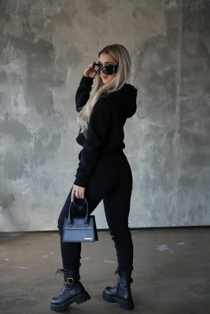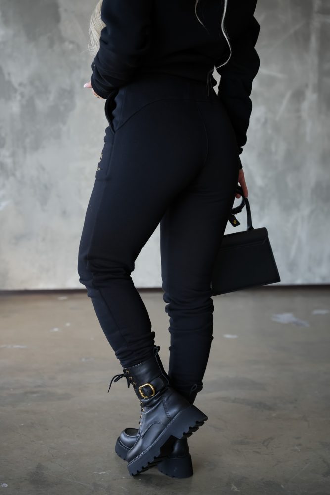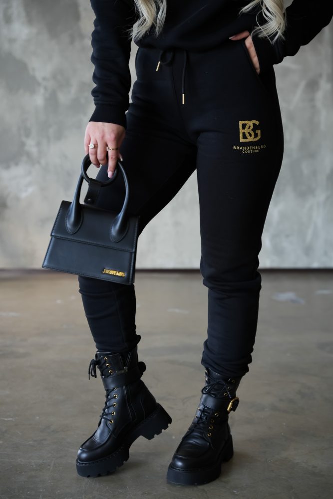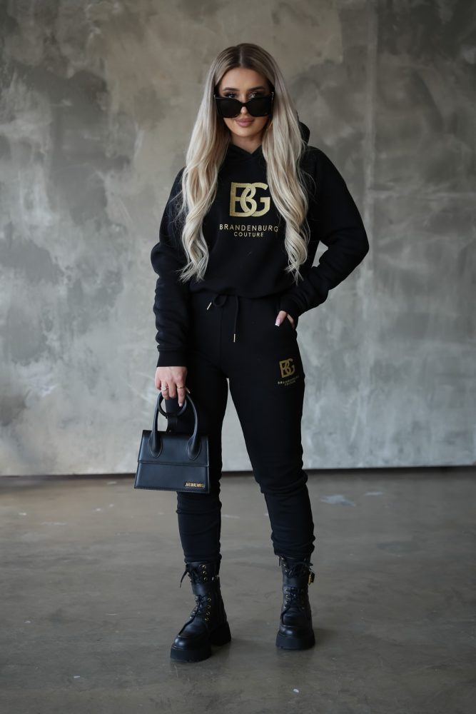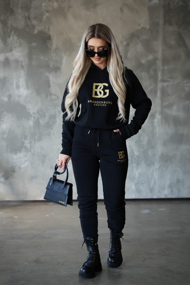 BG ORIGINAL Baumwoll-Sweatshirt-Set aus isolierendem Strickstoff in Schwarz. Sweatshirt mit Kapuze, verziert mit einem großen gestickten BG-Markenlogo in Gold. Die Hose hat einen elastischen Bund und einen Kordelzug mit dekorativen Enden in Gold. Gesticktes Markenlogo BG COUTURE auf der linken Hosentasche. Die Hose modelliert die Silhouette.